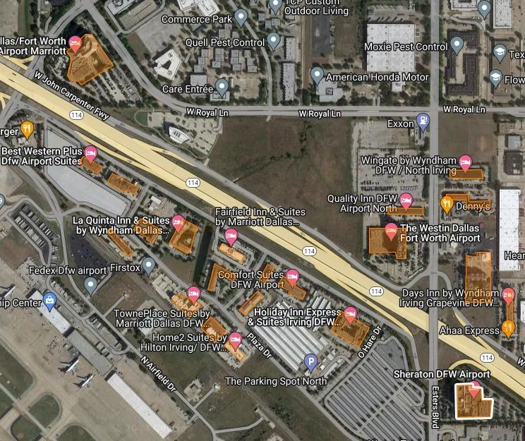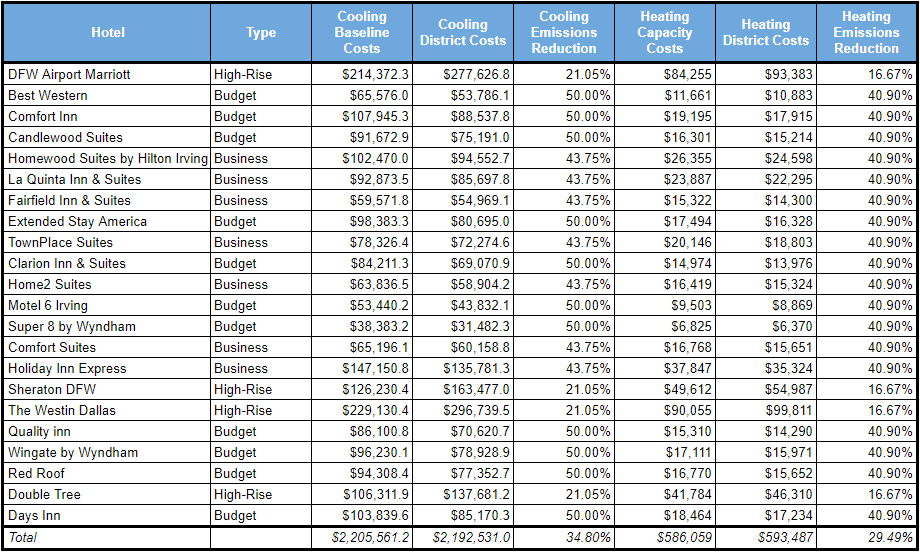 To gain insights into the potential benefits of a district energy system, we have conducted a sample calculation on a hotel cluster located in close proximity to the Dallas/Fort Worth International Airport (DFW). This cluster comprises 22 hotels, representing a diverse range of budget, business, and high-rise establishments, all within a half-mile radius.